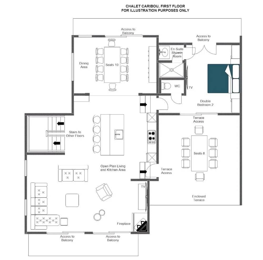 The chalet is spread across three floors and 210m2 of floor area. Sleeping ten guests in five beautiful en-suite bedrooms, Chalet Caribou is part of a newly built complex and is connected to the neighbouring chalet.
