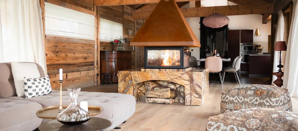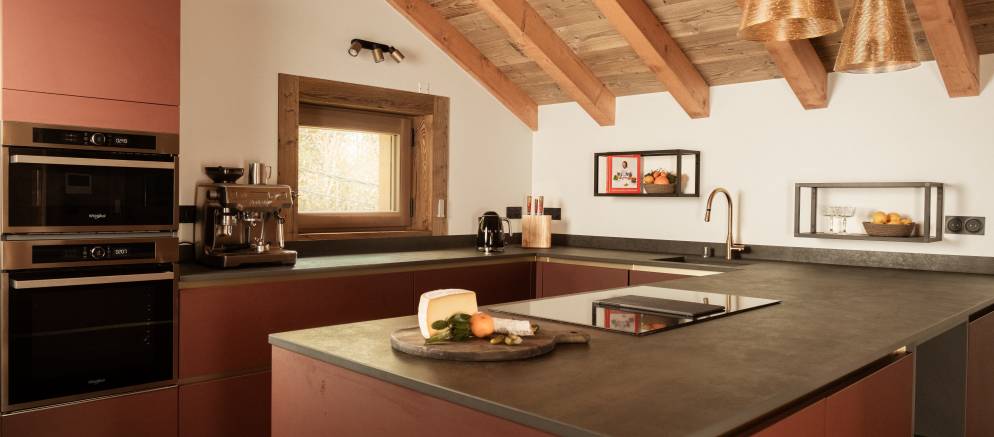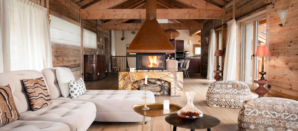 The spacious living area sits to one end of the top floor and spills out onto a large terrace. There are large sofas and pouffes to relax on and a striking modern fireplace adds warmth on snowy nights. To the other side of the fire is the dining area with table and open kitchen.
