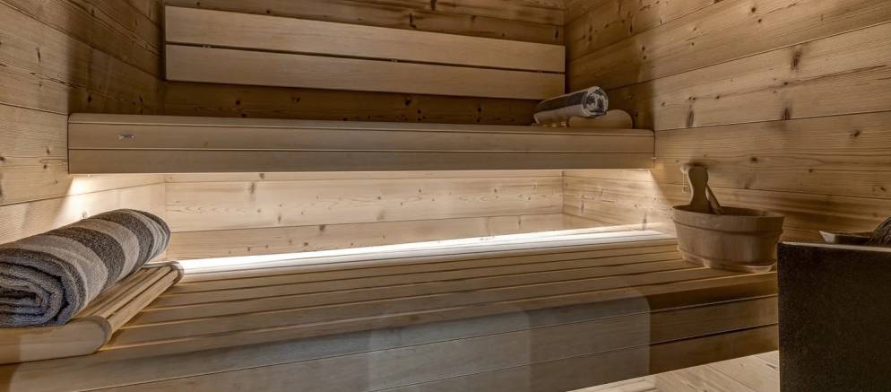 Your private wellness facilities are on the lowest level and feature an indoor swimming pool with counter current system, a large outdoor sunken hot tub on the sun terrace, as well as a sauna. After a day exploring the ski slopes of Meribel you can simply unwind in the pool and admire the mountain views.