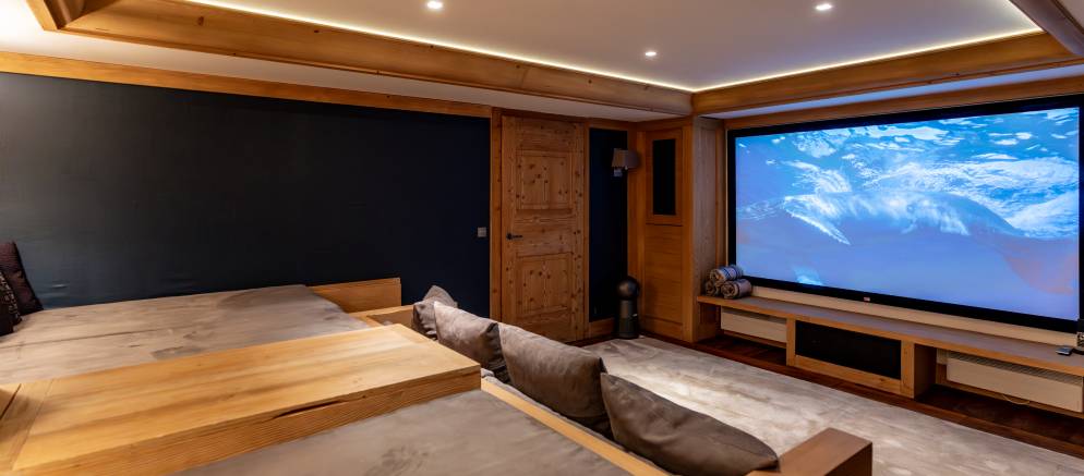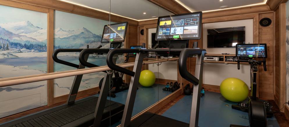The lovely open plan living and dining room has plenty of comfortable sofas where you can relax by the open fire enjoying the surround sound music system. The living room opens out onto a large balcony overlooking the piste. Downstairs the chalet has a Blu-ray cinema room with high definition screen, surround sound and a wide selection of films. For the more energetic there is a fitness room with running machine and exercise bike.