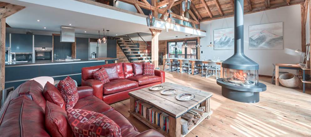 The entrance level of the chalet is a large open plan living, dining and kitchen area that is flooded with light and sunshine through the massive glass fronted wall that looks out to the outdoor decking and Parc des Dérêches. The glass doors open onto a balcony that enjoys the sunshine throughout the day and into the evening. Also taking in this view is the sitting area that surrounds a wood burning stove and a large dining table complete with rocking dining chairs.