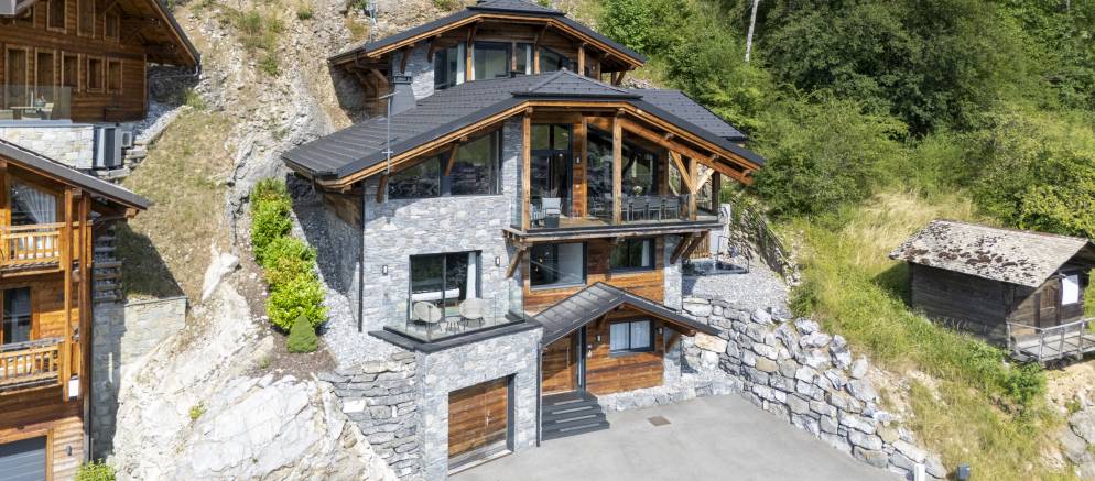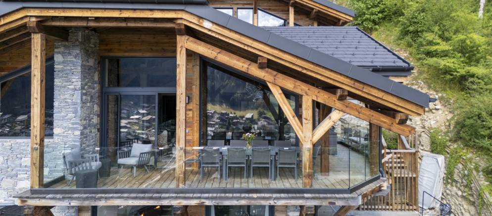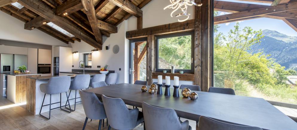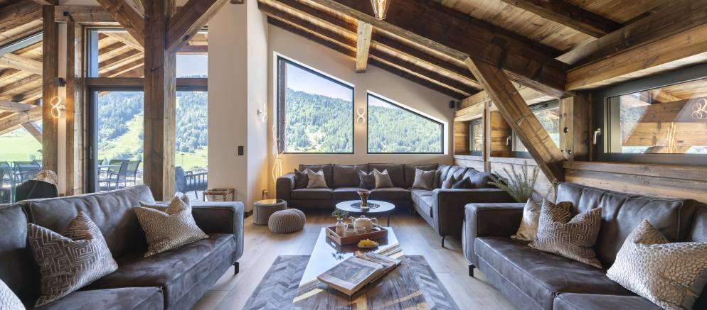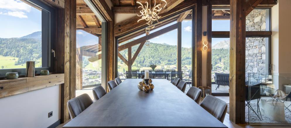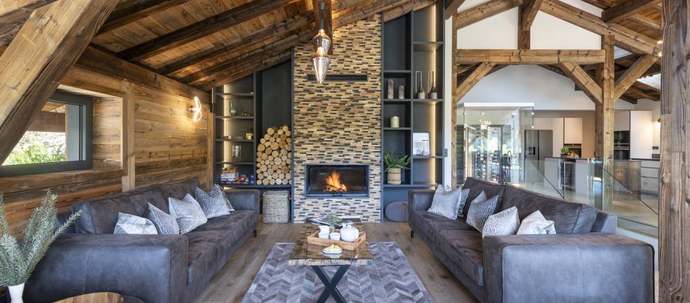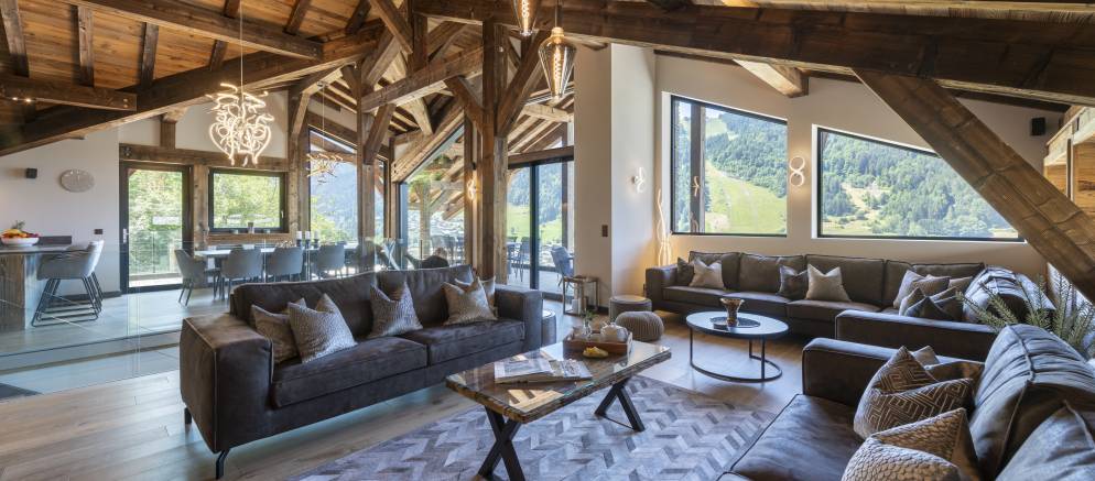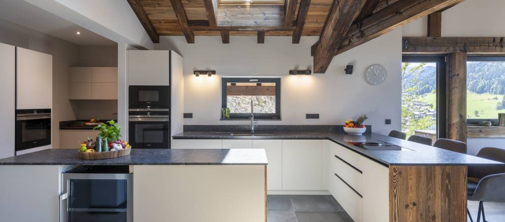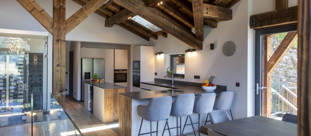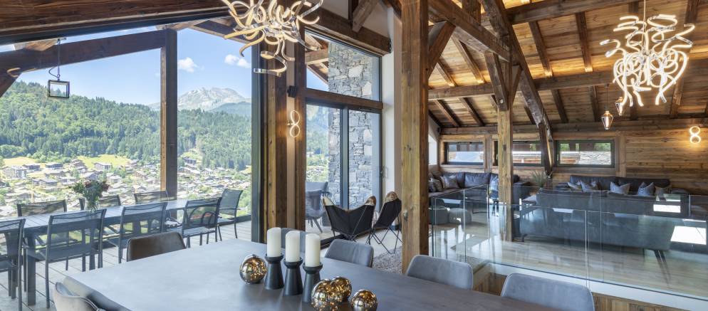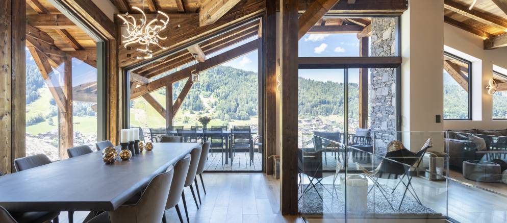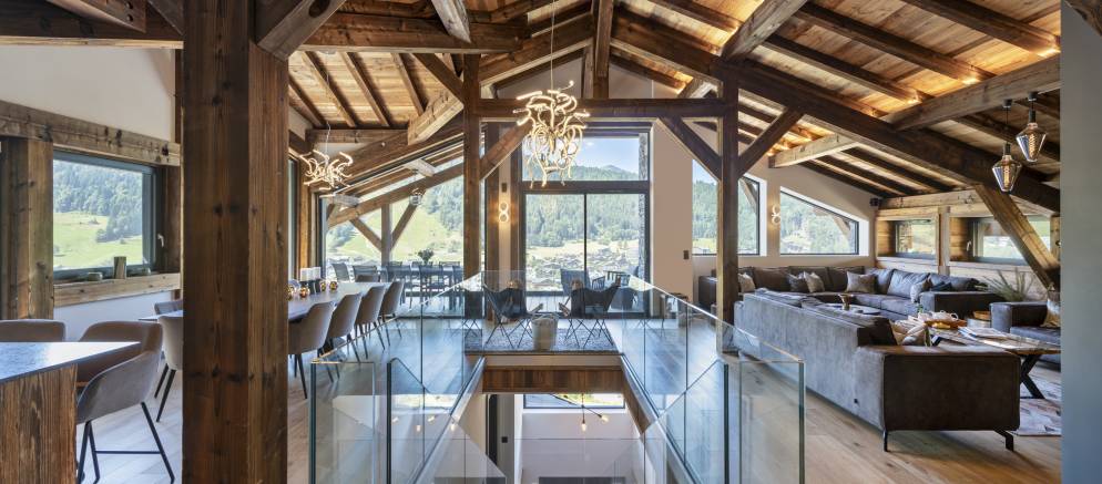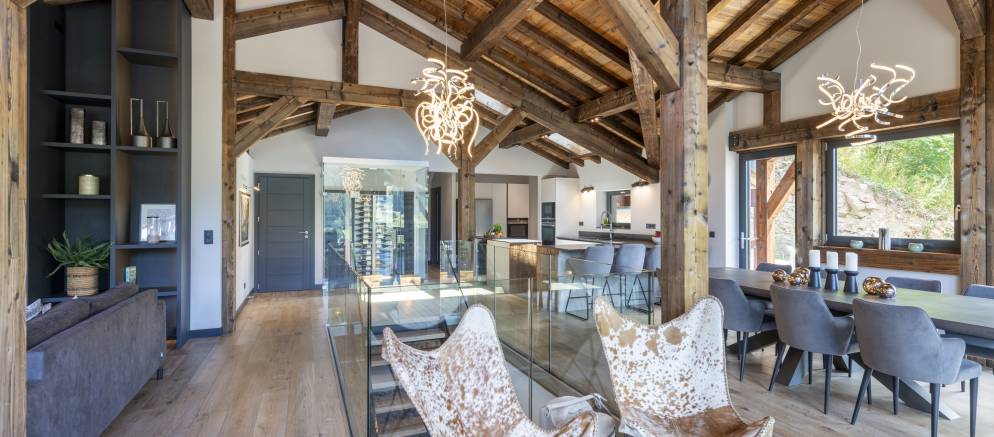 Arranged over four floors, the chalet has been designed for a thoroughly indulgent holiday. The open plan living and dining spaces are spread across the third level with floor to ceiling windows leading out to a wraparound deck. The fantastic kitchen is perfect for entertaining, the beautiful fireplace will create that cosy and warm winter ambiance, and pre-dinner aperitifs delightful on the balcony.
