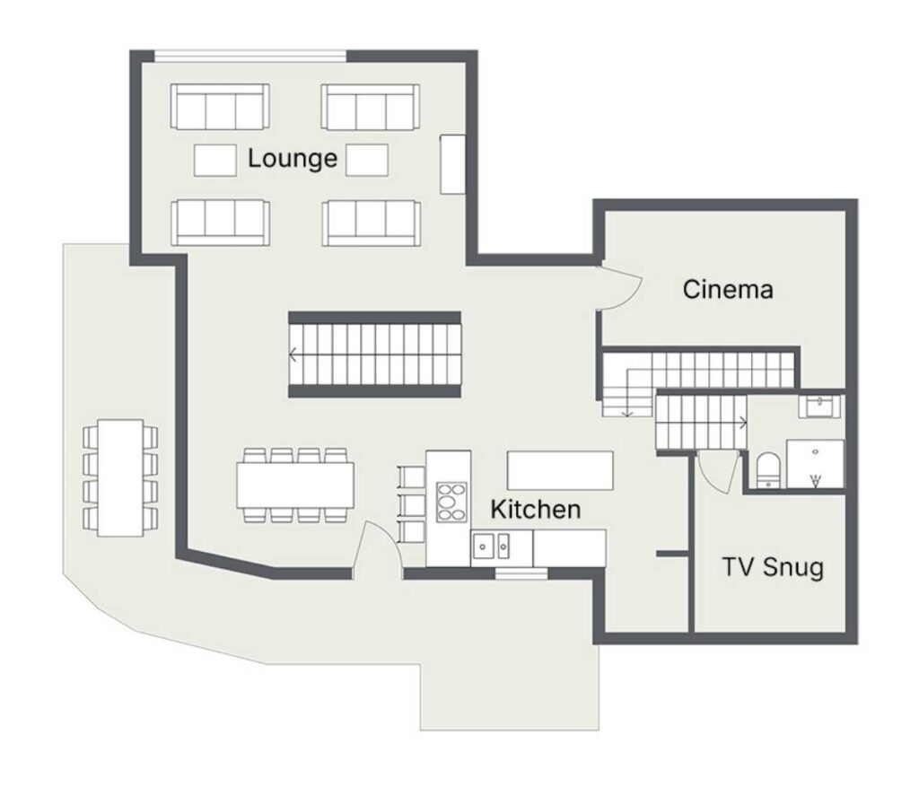 This floor also features two further entertaining rooms, with firstly a dedicated cinema room offering the perfect spot to unwind with a movie after a hard day’s alpine adventure. A separate TV snug is a great space as a children’s playroom where they can watch TV or play board games. A communal toilet/shower can be easily accessed from this room.