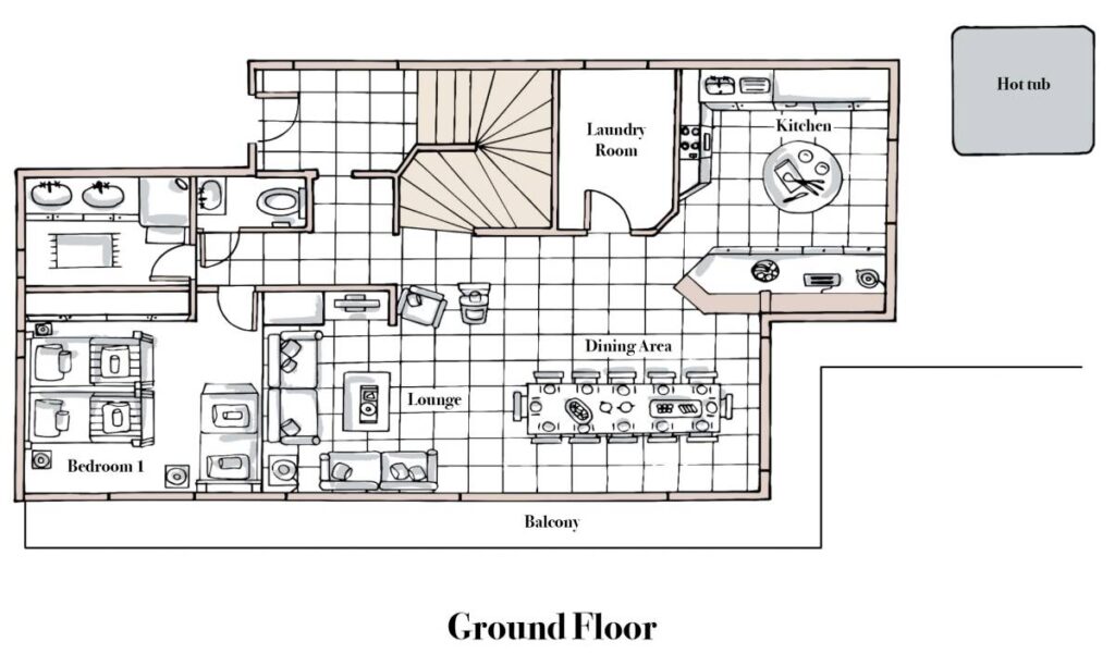 The chalet has a timber and stone build and is arranged over two floors. The south facing position overlooks the town and provides some of the best views in Morzine, best admired from the open-air hot tub. The open plan living space is full of wood panelling, floor to ceiling windows and a wood burner.