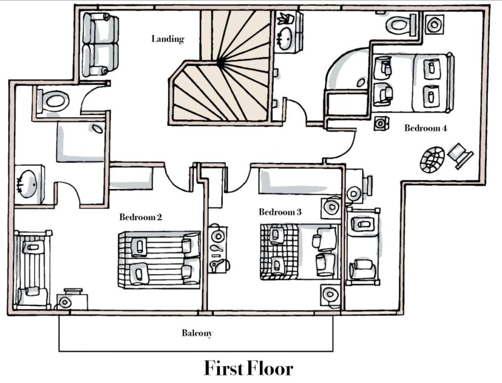 Sleeping 8 people in 4 bedrooms, it is possible to accommodate 2 extra children as two rooms can be arranged with triple occupancy. There is one bedroom on the ground floor and three on the upper floor. Two rooms have en-suite facilities, whilst two rooms share a separate shower room.