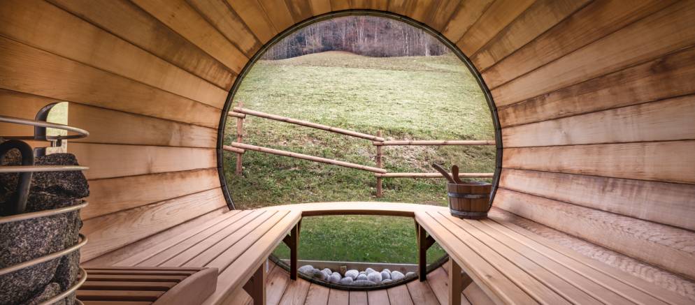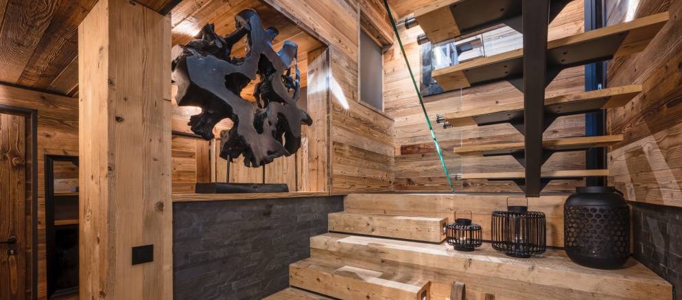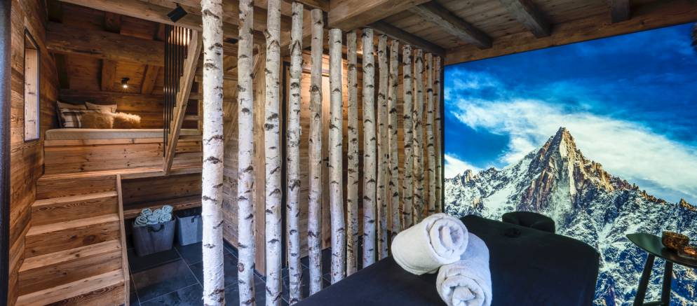 If that is not enough, there is more space to unwind on the third floor where there is a second living room. Curl up here with your favourite holiday book if your eyes are not distracted by the mountain views from the floor-to-ceiling windows. From here head through a hidden door to the wellness area with a massage room and shower, before stepping out to the terrace with outdoor barrel sauna and hot tub, offering views of the forest.