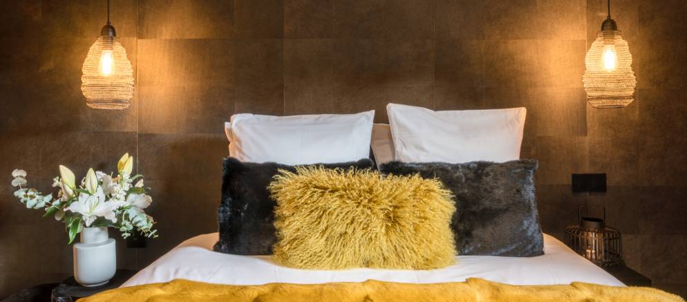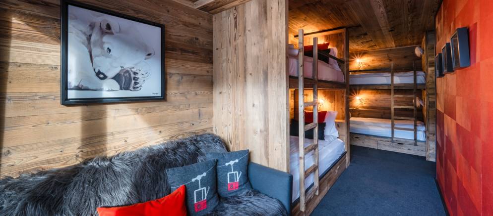 The heart of the chalet is on the second floor, where you’ll find the open-plan kitchen and dining area with a table seating 12 people. The kitchen is fully equipped for home cooking and features an island unit. Half a level up is the lounge area with TV nook, large sofas, and wood burning fireplace. For children and adults alike, there is a selection of board games, and speakers for your playlist.