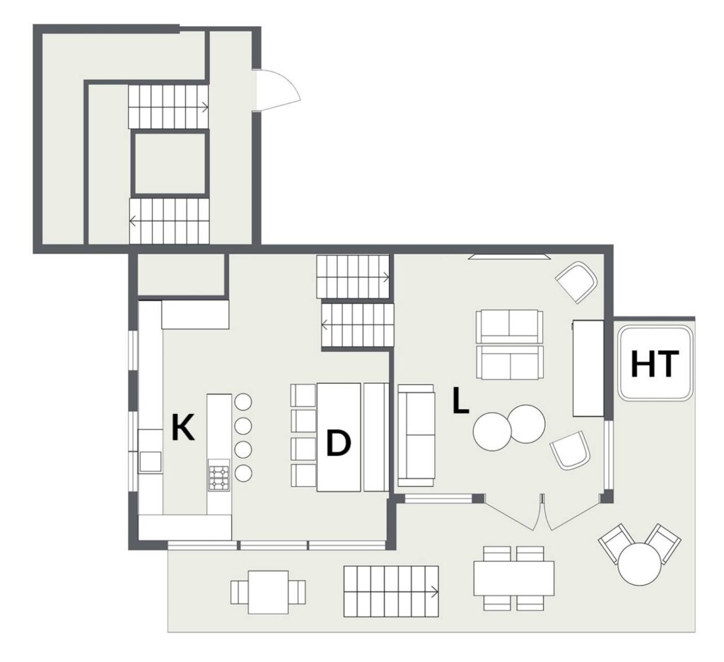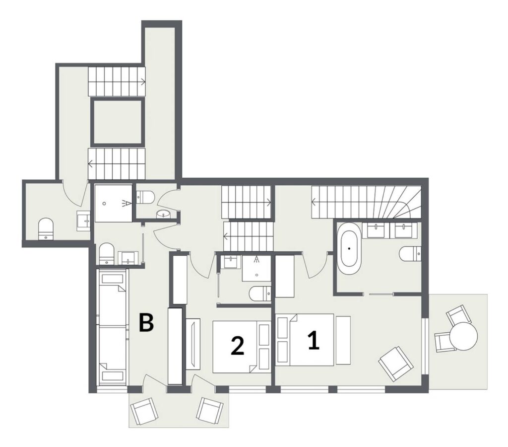 The three bedrooms are arranged on the lower floor, with the master suite featuring a large en-suite bathroom and private balcony. There is a second en-suite double bedroom as well as an en-suite quad bunk room, and both rooms share a balcony. For larger groups, why not also rent the neighbouring Chalet Goldilocks which provides a combined capacity for 20 people.