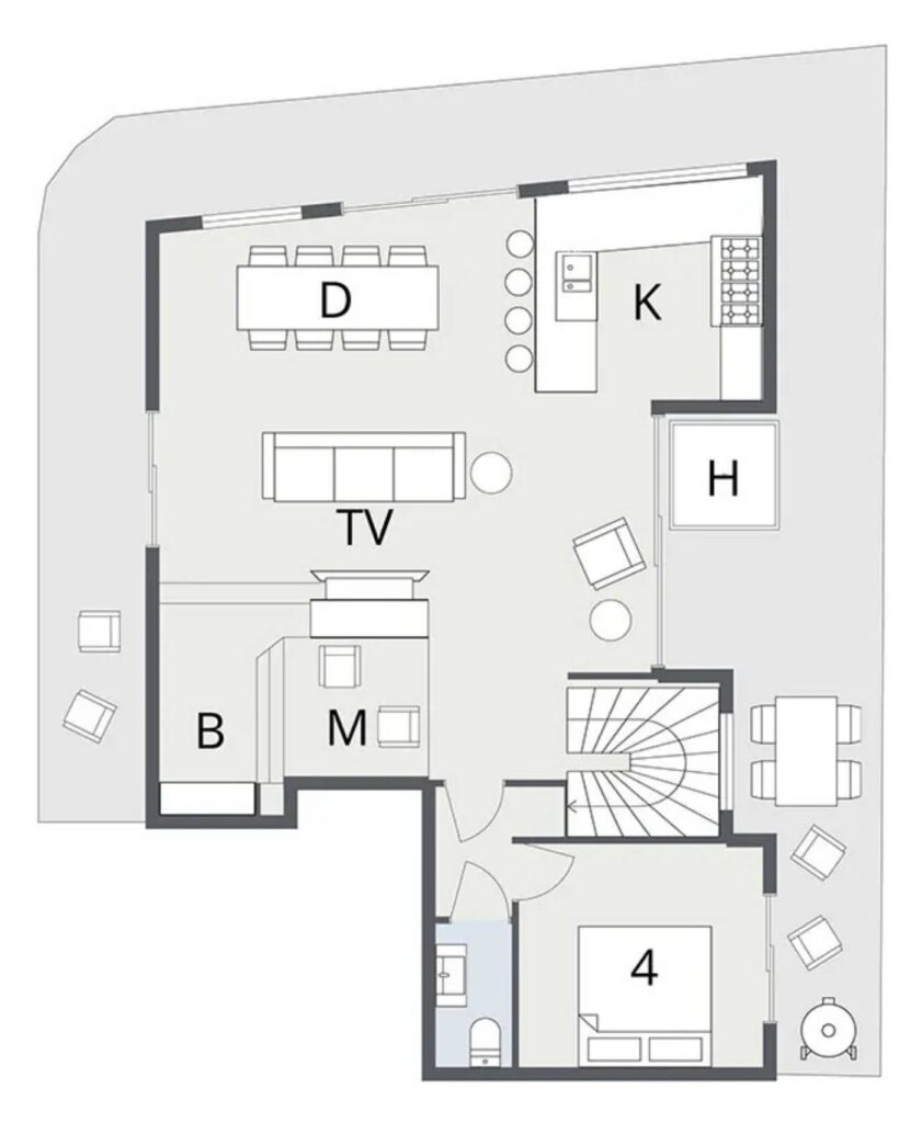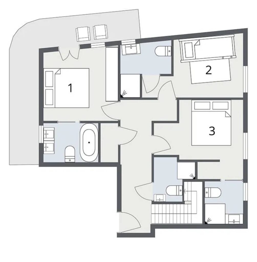 The fourth en-suite bedroom is tucked away from the living area on the top floor and has a king-size double bed. Outside the balcony wraps around the entire floor and provides spacious terracing and is home to the large 6 seat hot tub, which you can sink into for your own private après ski sessions. There are also several seating areas from which to simply enjoy the view or partake in some alfresco dining in the warmer months.