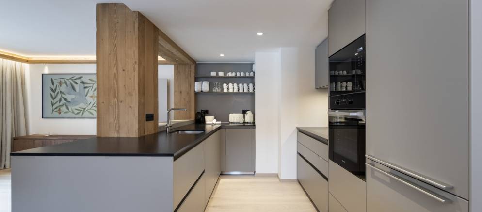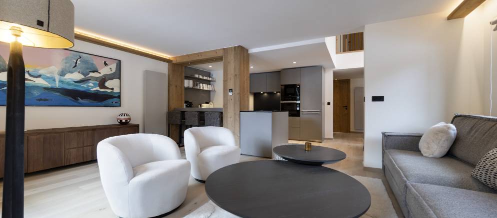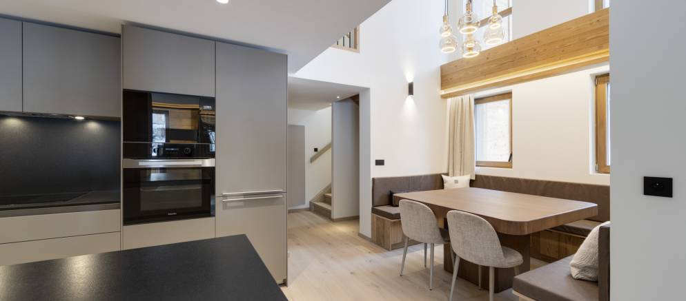 The apartment perfectly combines comfort, space and refinement. The open plan living space flows from the dining area and kitchen into the living room and out onto a balcony. The high-quality interior design subtly blends contemporary style with Alpine charm, creating a warm and modern ambiance.