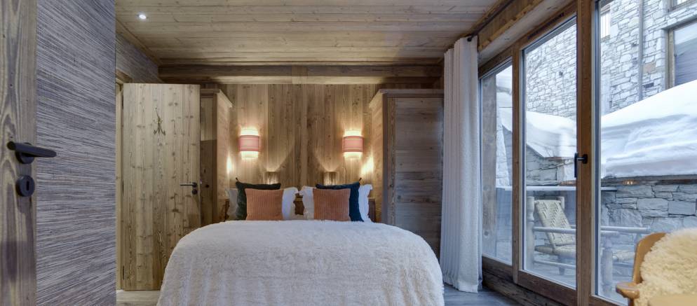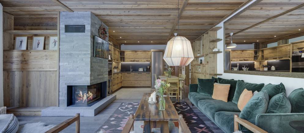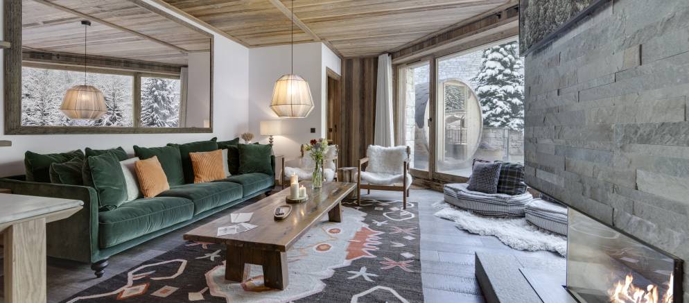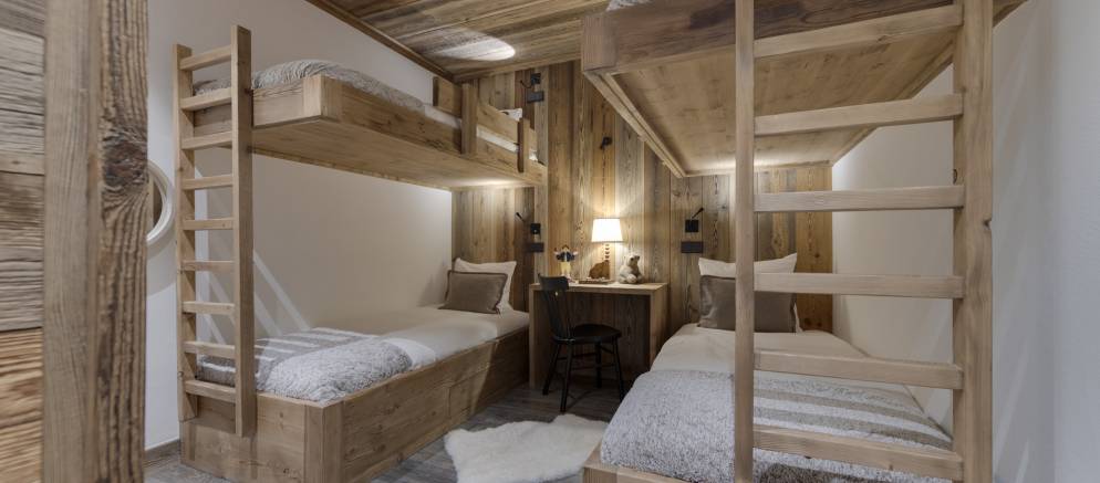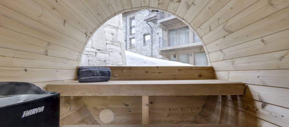 From the piste, you descend a few outdoor stairs to the entrance. The whole apartment is on a single floor and with the two double bedrooms at either end for those demanding privacy. The bunk room sits next to the open plan kitchen and dining space. The living room is enhanced by the floor to ceiling glass window and looks out to the substantial terrace with a circular pine sauna.