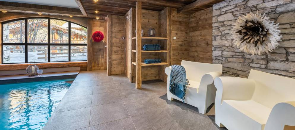 Sleeping 10 people, the five en-suite bedrooms are arranged over the ground and first floors. On the lower ground floor there is a spa area with indoor swimming pool and hammam, which is a welcome haven after an exciting day on the ski slopes. The ski room with boot warmers will ensure your kit is all ready for your next day’s adventures.