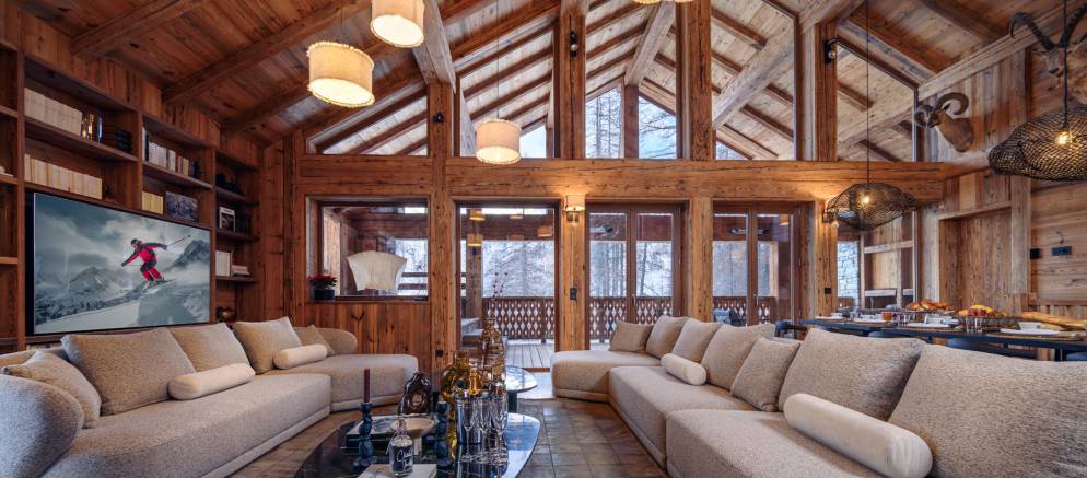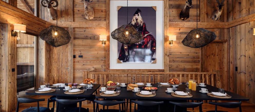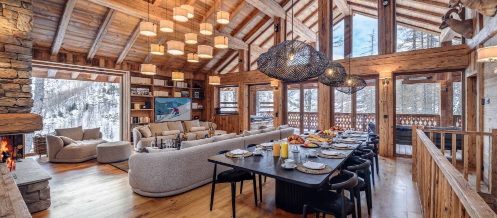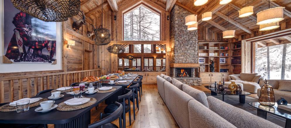 The chalet’s crowning jewel is its magnificent top floor, with double height ceilings and enormous windows flooding the room with light. The majestic stone fireplace and opulent seating area are a wonderful place to gather with family and friends for canapés and champagne, and the spacious dining area provides a sumptuous setting for delicious four-course meals.