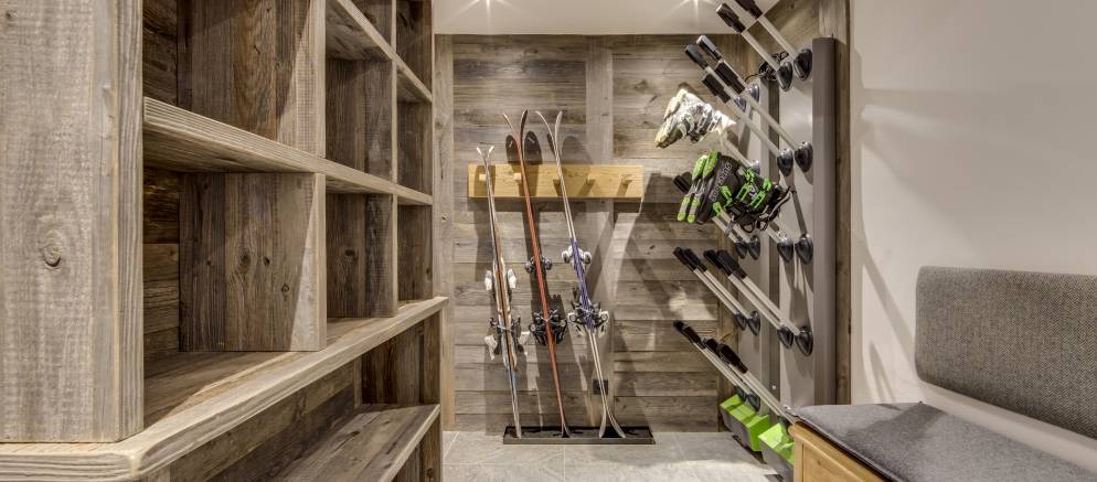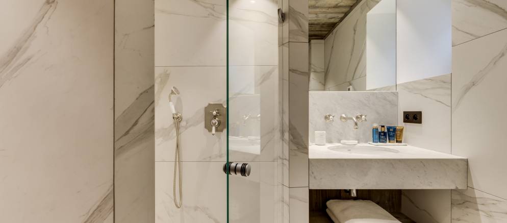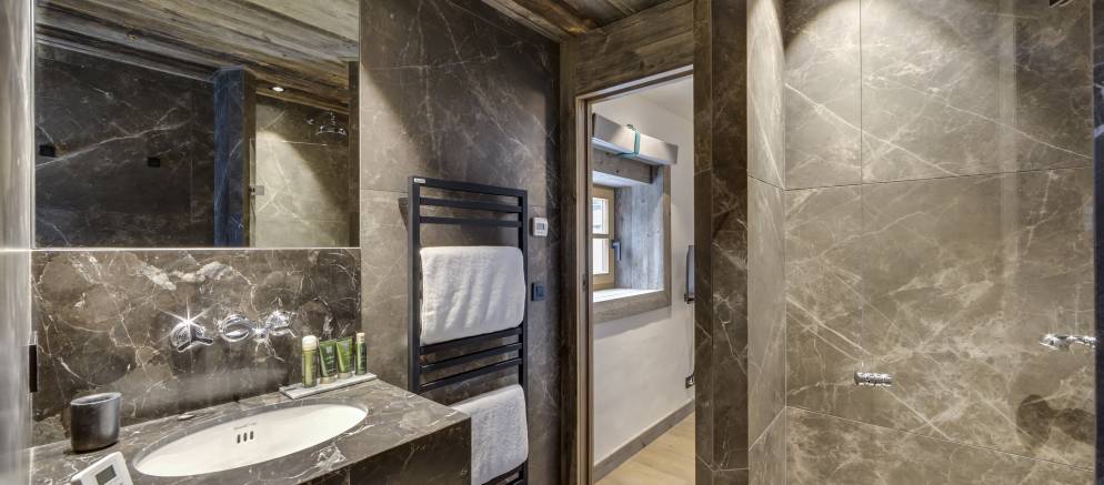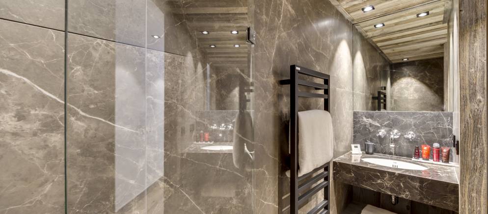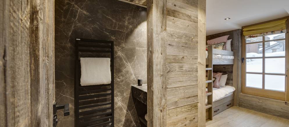 The entrance to the chalet is on the ground floor where you will find the first two bedrooms, one of which is the bunk room, but still has adult size beds. Climbing the stairs to the middle floor, there are a further three en-suite bedrooms. Each bedroom is equipped with its own bathroom with either a bathtub or a shower and finished in light or dark marble.
