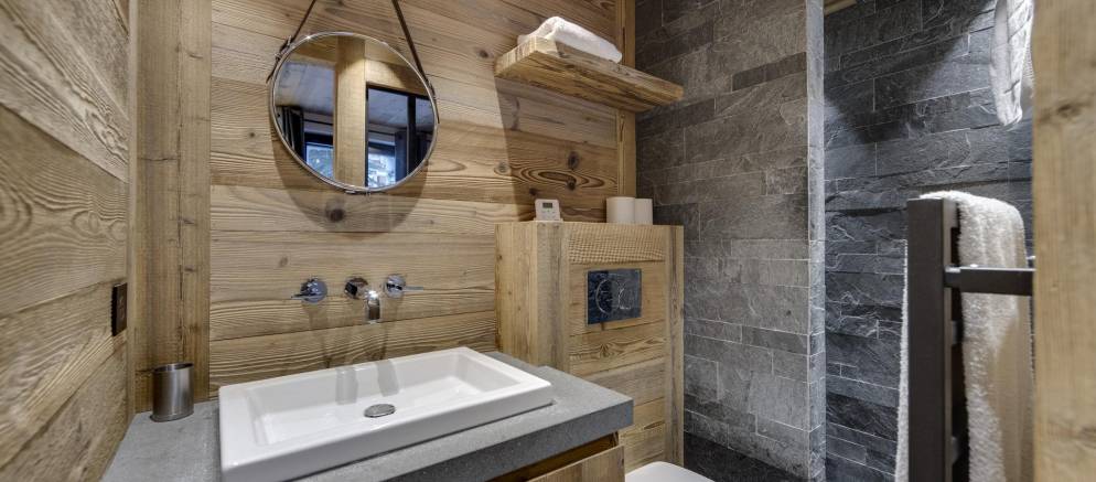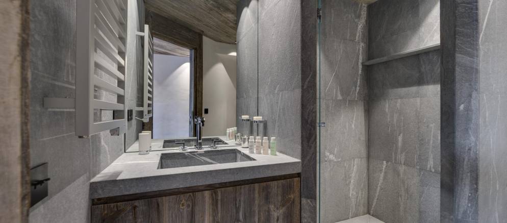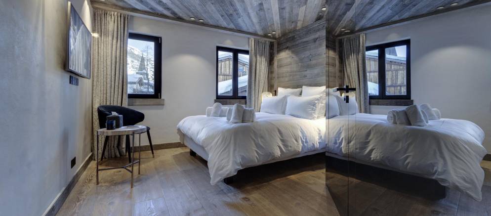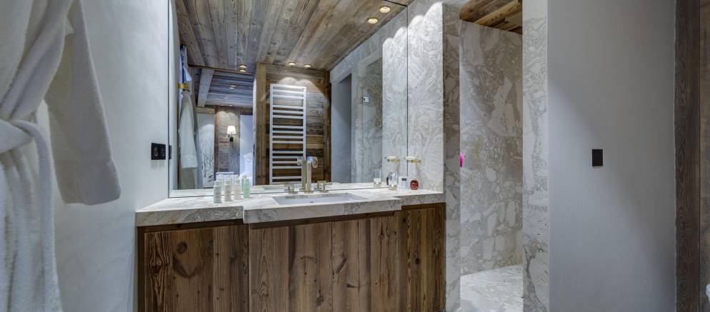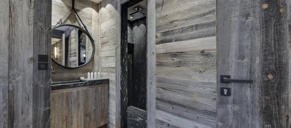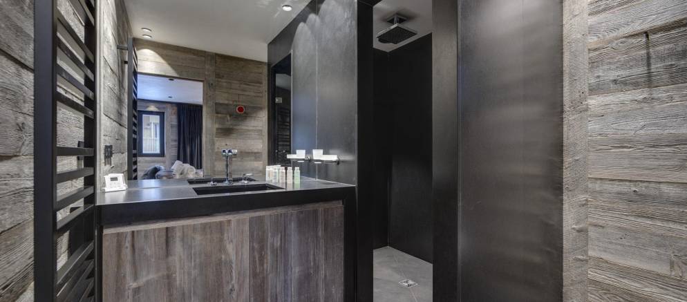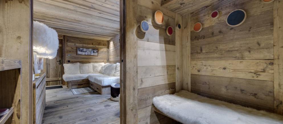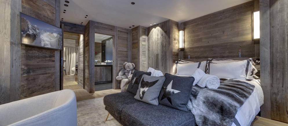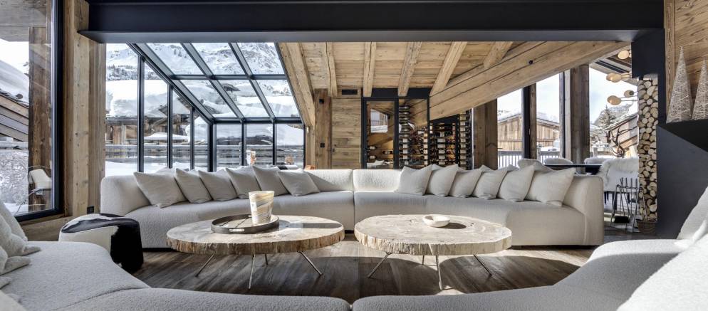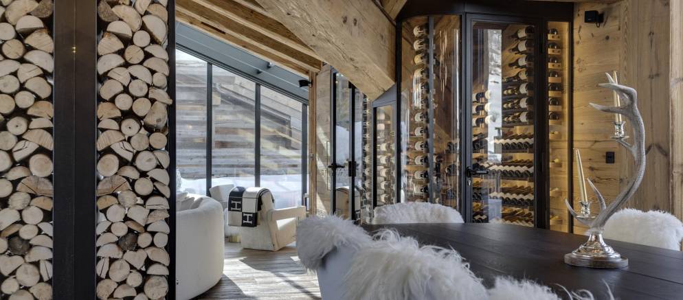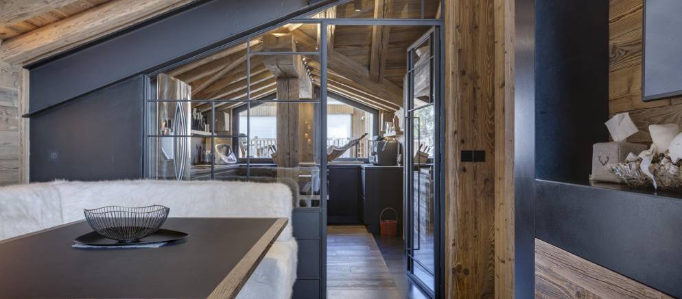 At the top of the chalet the grand communal spaces are cocooned by a beautiful wood roof supported by striking steel beams, and views framed by uniquely designed windows. In the lounge, huge, curved sofas are centred on the fireplace and provides a central space for everyone to enjoy together. A separate seating area with armchairs is a cosy spot to enjoy your favourite tipple with the stunning backdrop of the Bellevarde mountain.