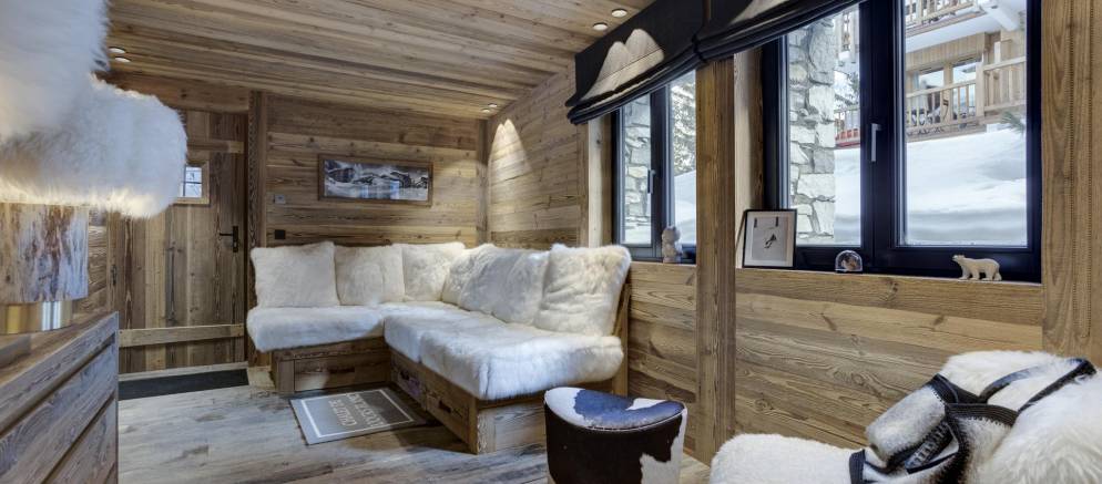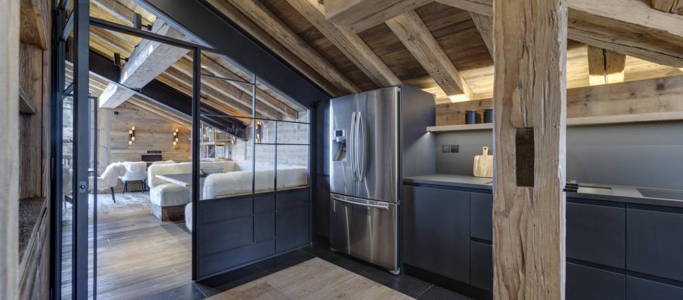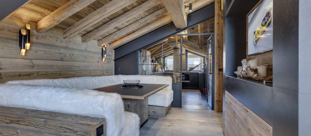To the other side of this floor is the dining area with long table sitting beneath a chandelier and with views across the rooftops of Val d’Isere. Adjacent there is a smaller dining area with wrap-around banquet sitting facing onto a TV – a great spot for children’s early suppers. From here you can step through to the fully equipped kitchen.