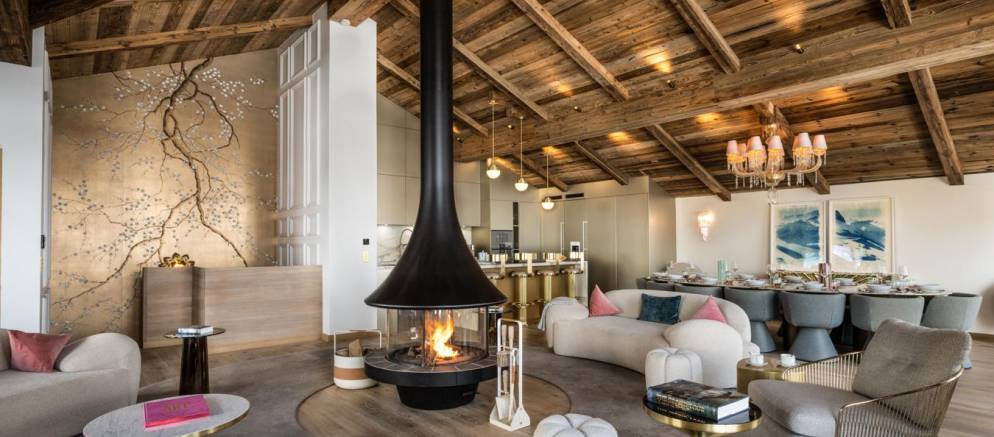 On the top floor are the grand open plan living spaces with a beautiful timber roof and contemporary styling. Sofas and armchairs are arranged around the striking central fireplace with plenty of room for the group to spread out. The dining table seats 12 and sits beneath a chandelier, whilst the kitchen is fully equipped for home cooking. Outside a terrace offers views onto the ski slopes.