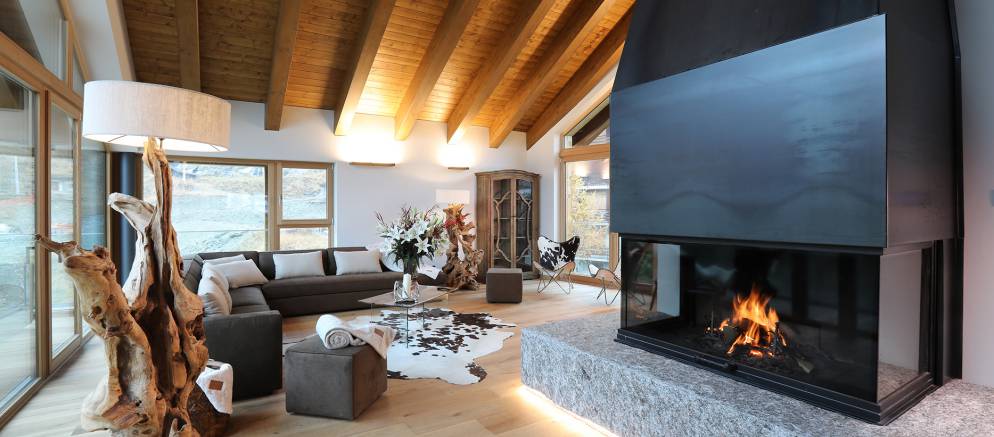 The chalet is arranged over five floors and 870m2 of space all connected by both stairs and an elevator. The entire top floor, with vaulted ceilings and large picture windows, is given over to the living and dining rooms. To one side is the living room which features a grand central fireplace with L-shaped sofas either side, so there is plenty of room for everyone in the group to relax together.