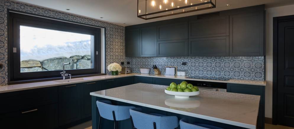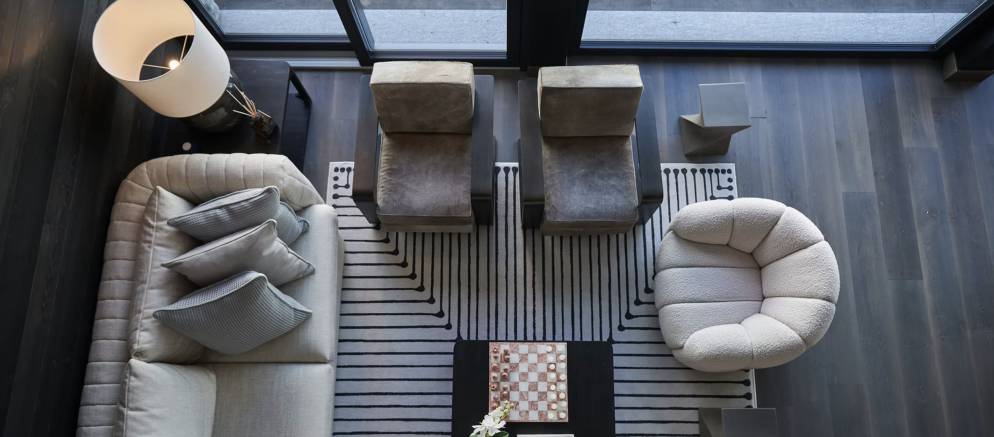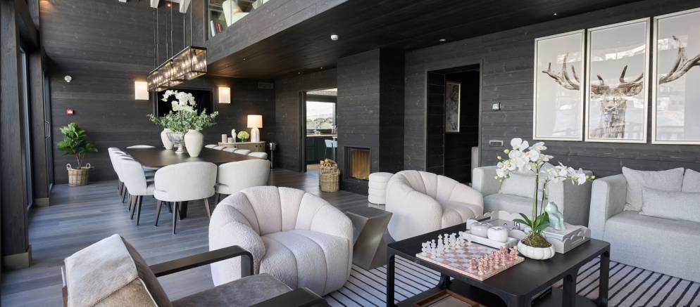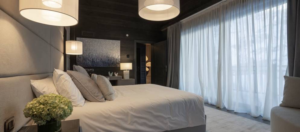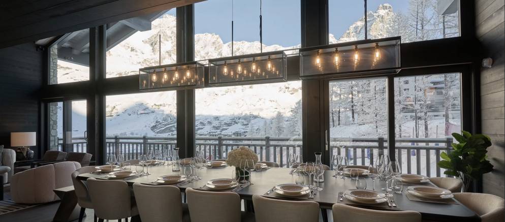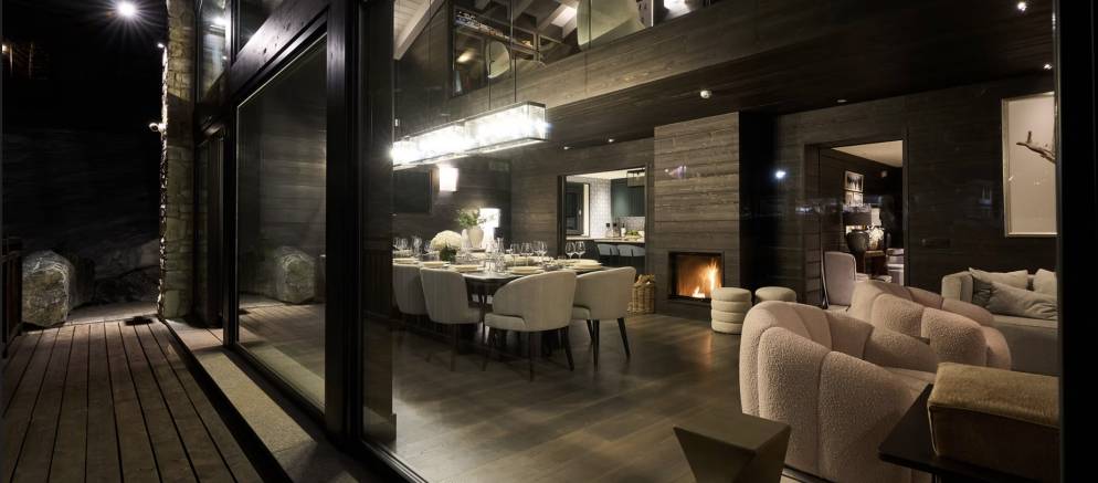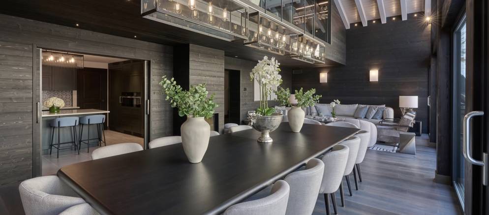 The open plan living space provides for a homely space for your group or family to entertain and unwind together. The grand wood table is the centrepiece where bespoke dinners and delicious breakfasts will be served. Afterwards unwind by the fireplace, relax on the sumptuous sofas, or simply gaze at the snow-covered mountains from the full width balcony.