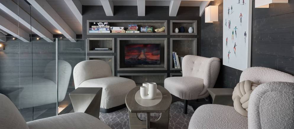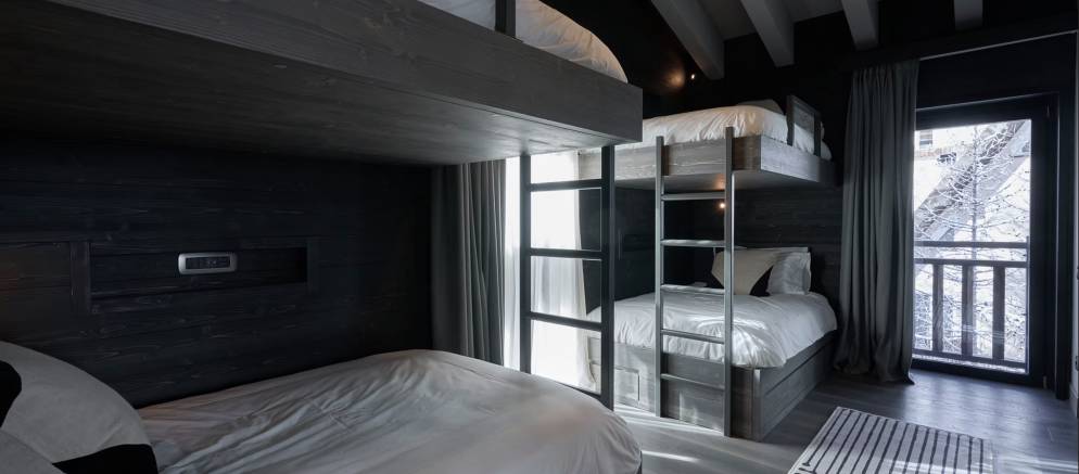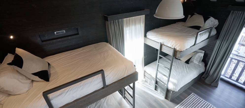 The chalet can accommodate 12-14 guests in six en-suite bedrooms spread between the first and second floors. On the first floor are two double and two twin/double bedrooms, as well as a mezzanine lounge area and bar that overlooks the main living spaces below. On the top floor is the master suite with high ceilings and Matterhorn views, as well as the quad bunk room with four queen sized beds suitable for either adults or children.