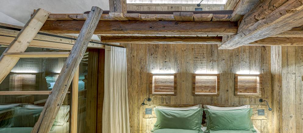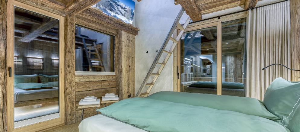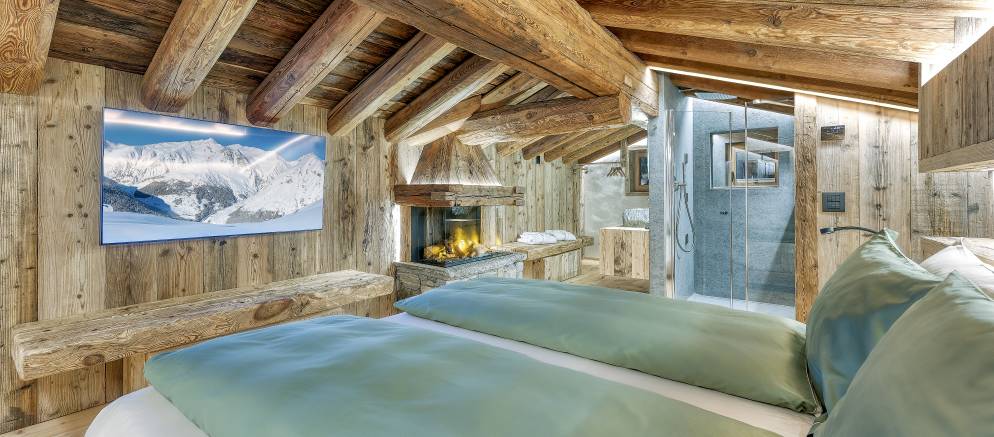 The remaining four bedrooms are arranged across the top two floors of the chalet. The first is a double bedroom that has a corner fireplace, 2 private balconies and an en-suite with double shower. The next is a spacious double bedroom with both a bath and shower and balcony access. This bedroom also has a mezzanine area with a single bed accessed by a wood ladder.