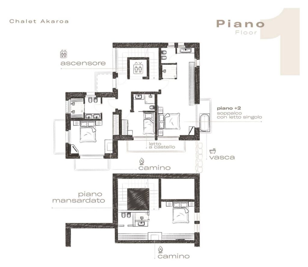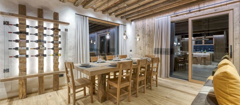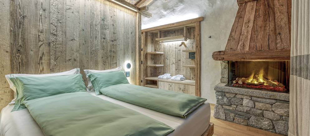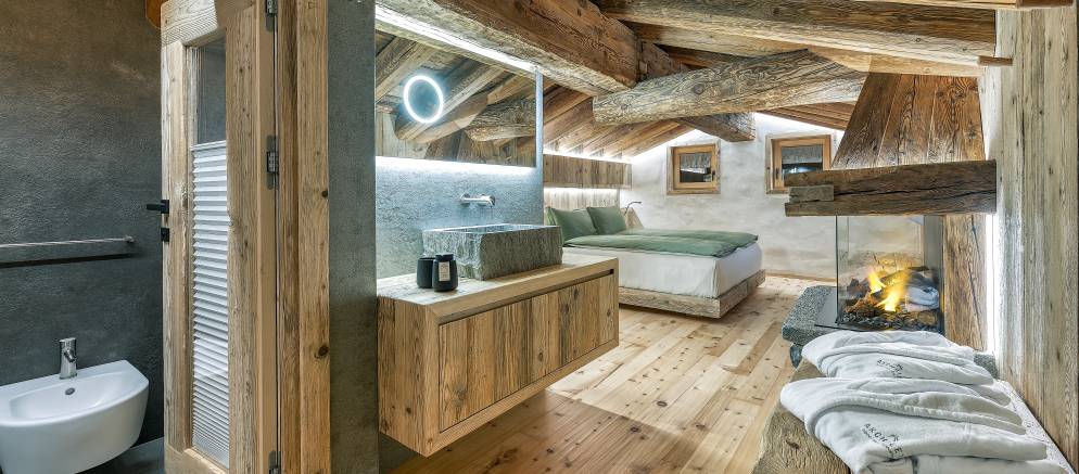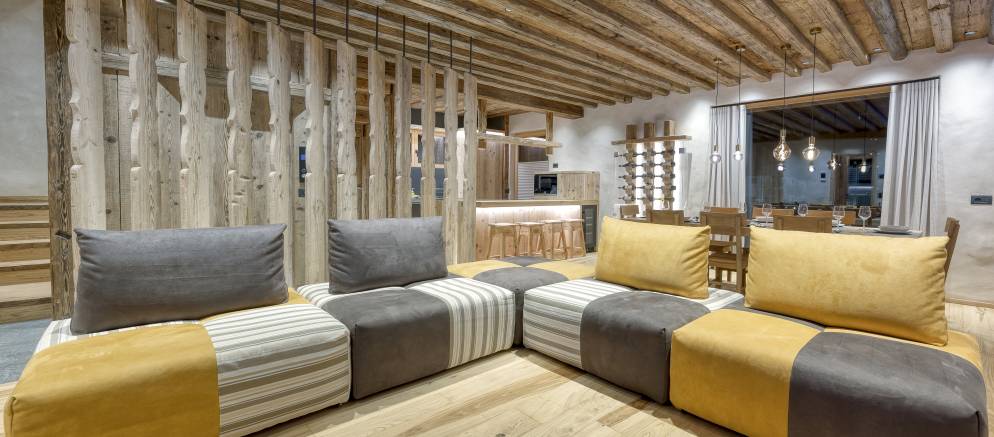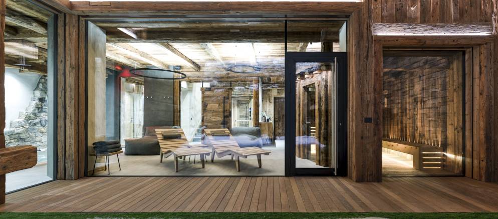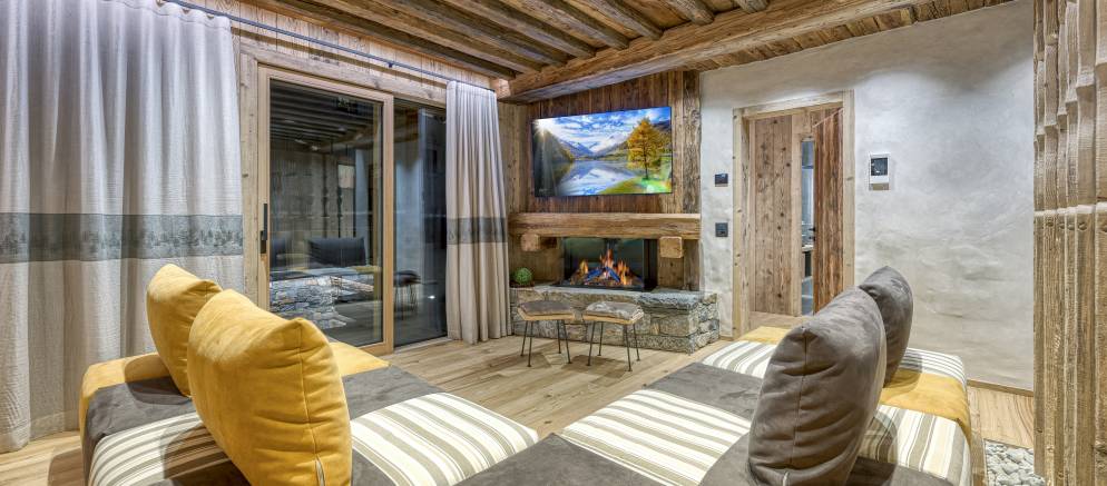The chalet is arranged across four floors and 380m2 of floor area. Stairs connect all levels, with an elevator connecting the lowest three floors. From the moment you arrive, you will be struck by the beautiful use of traditional materials from the old wood, stone and white walls. Inside, the authenticity of these warming and cosy materials is complimented with numerous fireplaces and soft lighting.