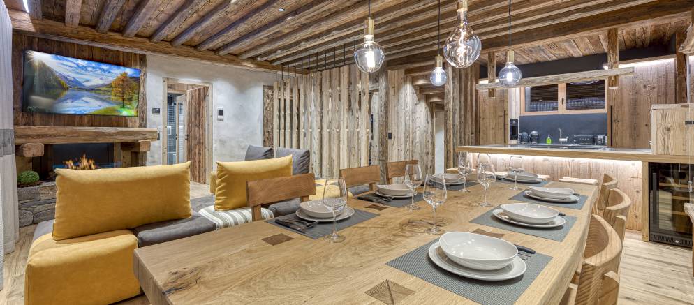 Entering the chalet on the ground floor you step through to the open plan living spaces that invite your group to spend quality time together. The lounge features a large and bold L-shape sofa that faces both the corner fireplace and a large flat screen TV. Adjacent is the dining table seating 8 whilst the open kitchen overlooks the whole room and is equipped with the latest generation appliances.
