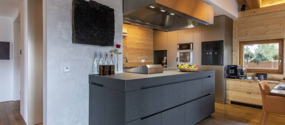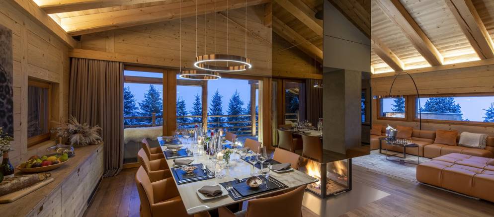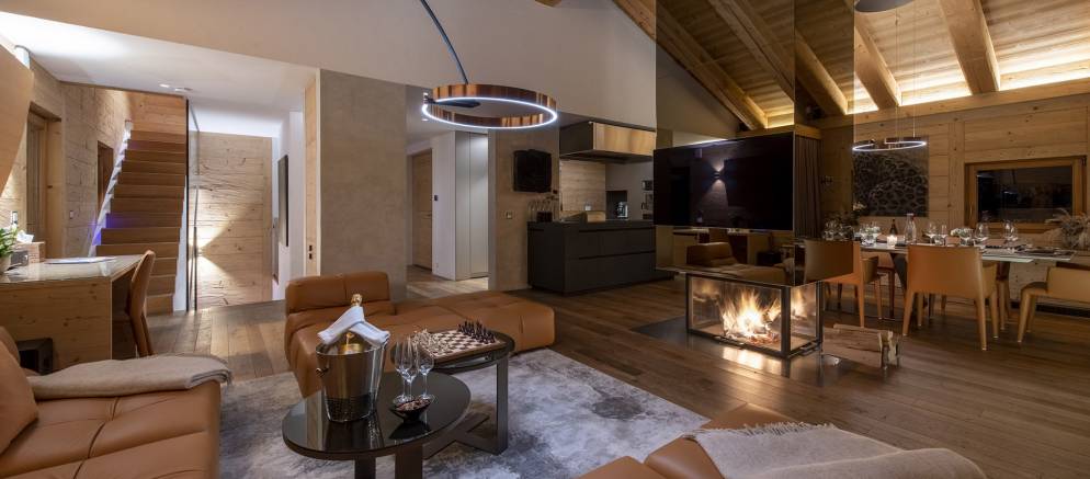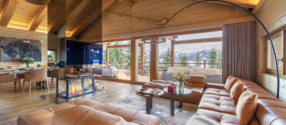 The living room is spacious with materials and colours offering the promise of complete relaxation and south, east and west facing panoramic views of the Alps. The central fireplace, an important architectural element underlining the rooms contemporary atmosphere, has a hearth level with the floor.