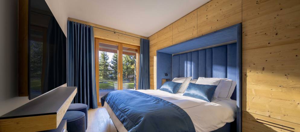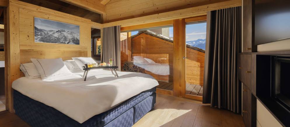 The chalet sleeps 10 guests in 5 en-suite bedrooms. The master suite on the top floor has an original glazed gas flame fireplace cut in the wall opposite the bed, and through the flames the view is to the mountain beyond. Within the master suite is a luxury bathroom, with rain shower, a private Jacuzzi bath with mountain views, and twin his and her basins.