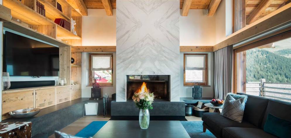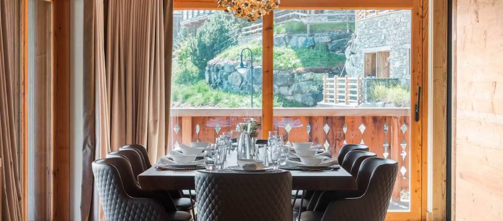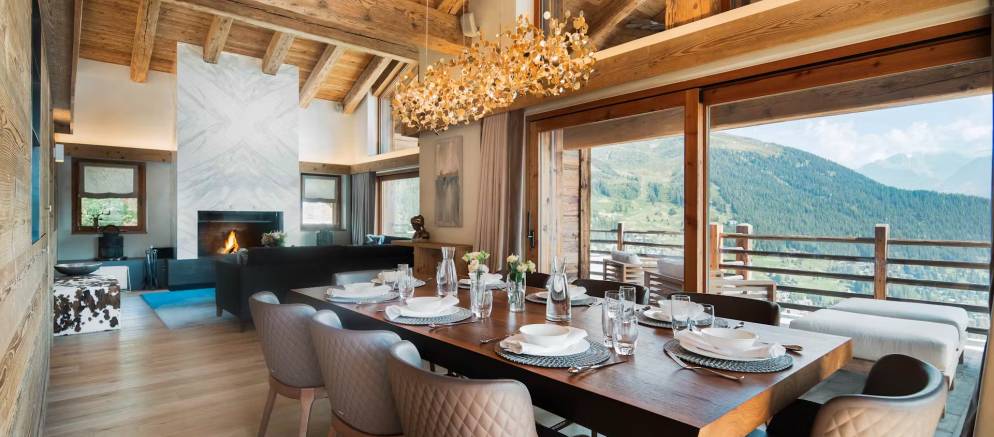 The living and dining area occupy the top floor of the chalet and take full advantage of the show-stopping views made possible by the chalet’s elevated setting in Sonalon above Verbier. The open plan living and dining room stretch across the breadth of the chalet so that the views can be enjoyed at all times.