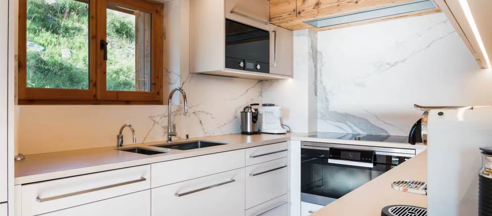 A wonderful wood-burning fireplace built into a solid marble column ensure a snug ambience and comfortable seating around it make it the perfect place to enjoy a glass of champagne. The sophisticated dining table seats up to eight guests and the modern kitchen sits behind this room and can be closed off from the living and dining area allowing for a greater level of privacy.