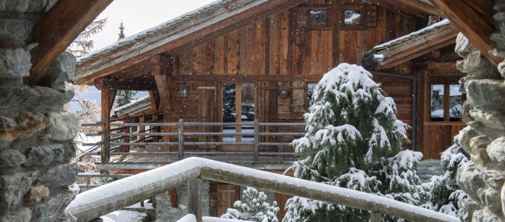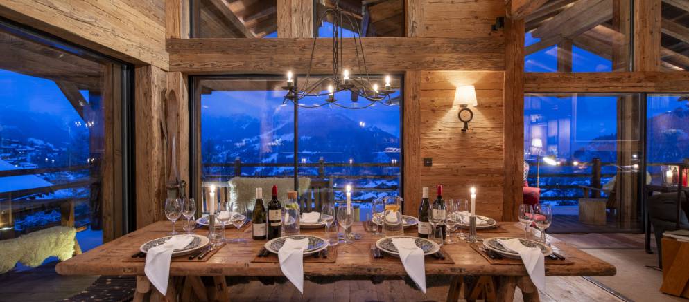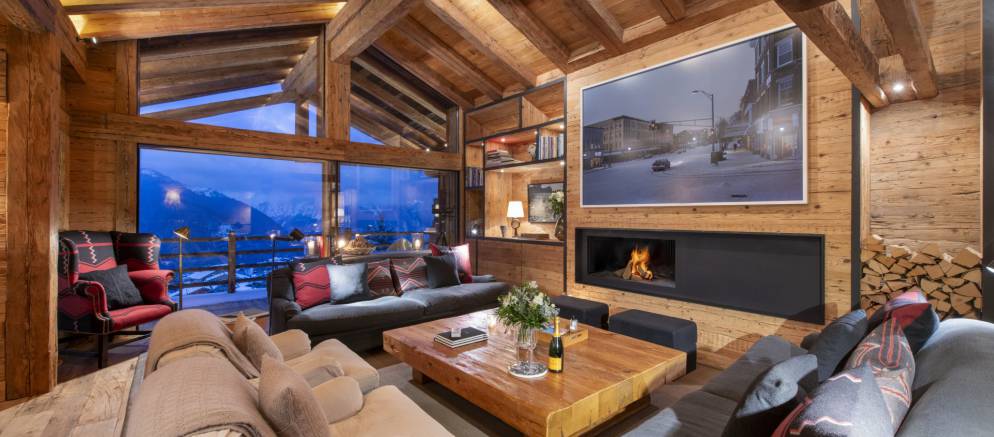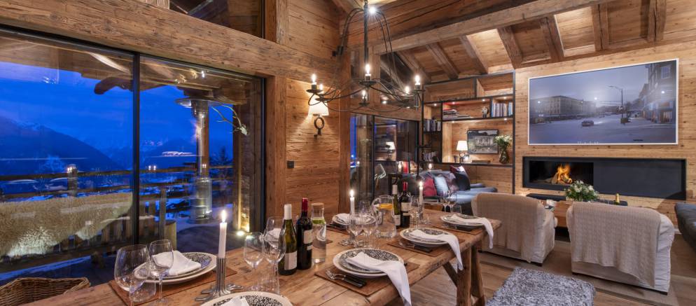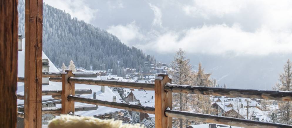 In the evenings, as the day fades to night, floor-to-ceiling windows flood the room with stunning mountain views and the twinkling lights of Verbier. Outside, a wide balcony is decked out with outdoor furnishings, a heater, and plush sheepskins, offers an idyllic setting for morning coffees and al-fresco moments.