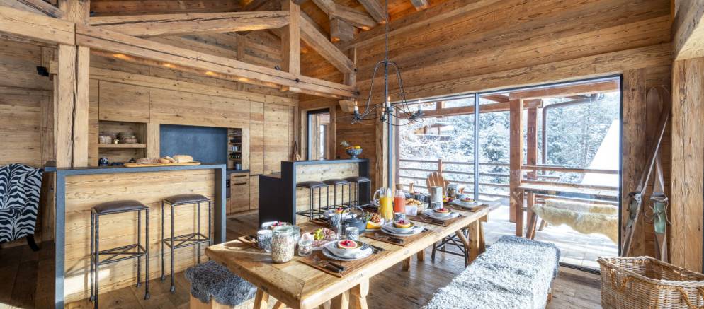 Entering the open plan living, dining, and kitchen area brings you into a world of warmth and elegance. A traditional mountain ambiance is enhanced by the wood-burning fireplace and tasteful decor. The living space boasts ample seating and large coffee table that invites you to unwind. The dining table seats ten, with the adjacent open kitchen equipped with top-of-the-range appliances perfect for home cooking.