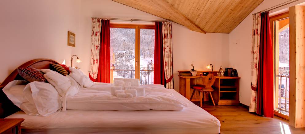 Tucked against a beautiful hillside, the numerous balconies and large terraces give you bird’s eye views of the village and the surrounding mountains, encompassing all three of Zermatt’s ski areas. Yet access is easy: 200m from the Matterhorn Express base lift station and resort run there is a street level tunnel which leads you to an elevator built inside the mountain, from the top of which there is a gentle 2 minute walk to the property.