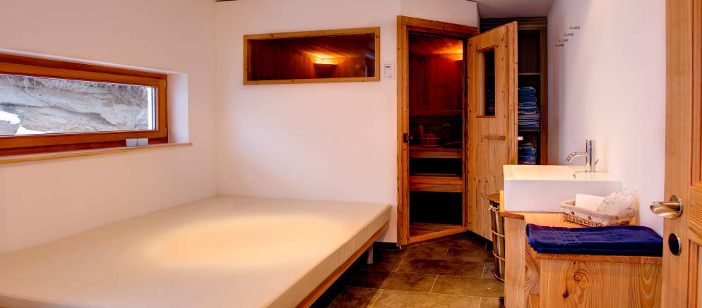 Each bedroom has its own TV (satellite/DVD) and stunning mountain views and with the exception of the small double room, its own balcony. On the ground floor, the living room has a patio terrace. The chalet is equipped with wireless broadband internet and a PC station for guest use. The chalet has its own sauna and unique outdoor hot-tub surrounded by snow – perfect to relax and enjoy the view (or the stars…) after a long day in the mountains.