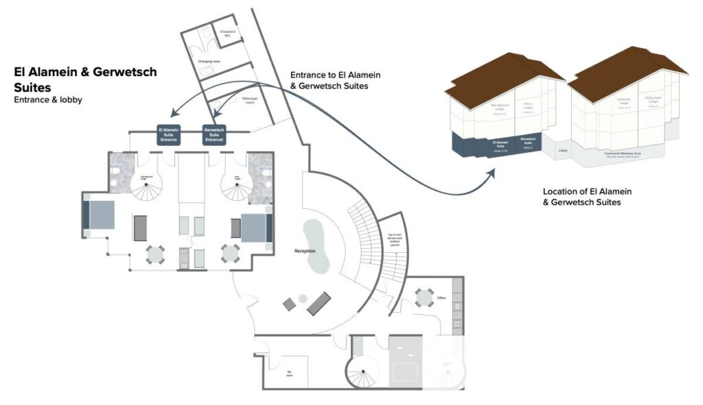Next to the El Alamein Suite is the Gerwetsch Suite that can be booked independently or inter-connected to create a larger suite sleeping 5. Above the suites are the Tete Blanche Lodge sleeping 5 and the Horu Lodge sleeping 8. The building on the other side of the lobby has 2 more lodges, Lyskamm Lodge sleeping 9 and Dufourspitz Lodge sleeping 10.