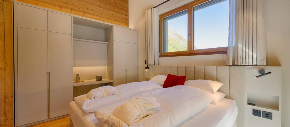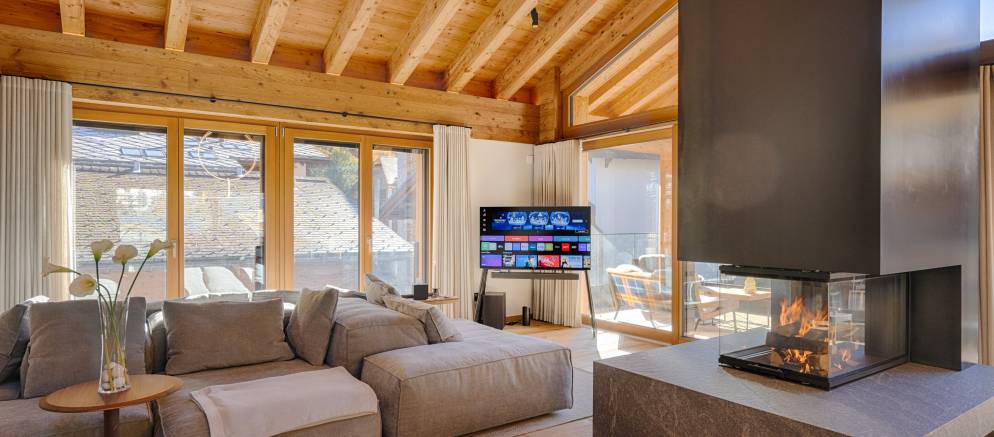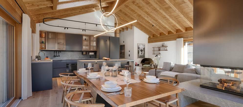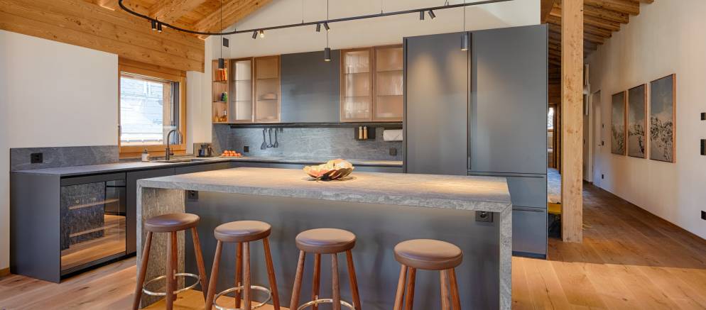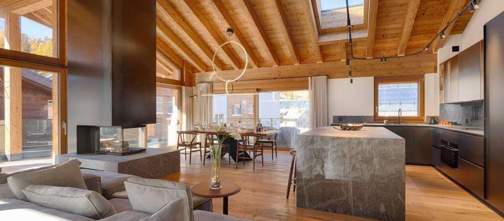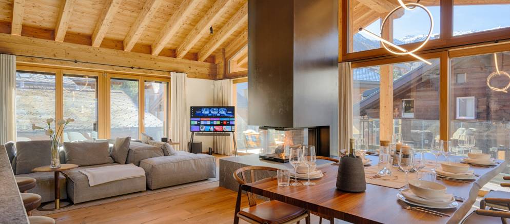 The open plan living room is equipped with a large Smart TV with 150+ channels in many languages. The open kitchen with island / breakfast bar overlooks the dining table, all complemented with designer lighting. This space opens onto a big, sunny terrace with Matterhorn views, as well as a separate west facing balcony.
