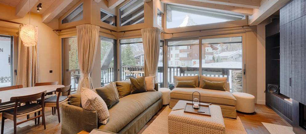 The Lodge is one of Zermatt’s flagship properties; a 5 star luxurious catered and serviced chalet that is quite unique. Situated close to the main street and the Sunnegga Express lift station, The Zermatt Lodge affords 320m2 of living space and takes up the whole top floor of a chalet, with an unmatched view over the rooftops dominated by the world famous Matterhorn.